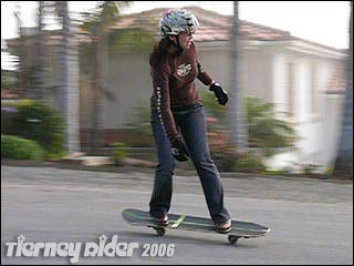 I visited my fearless bro who lives up the “coastal mountains” and convinced him to take some photos of me whilst I embark upon bombing the hills of RPV on this T-board contraption. After outfitting myself with some ghetto pads (a left-elbow pad, a red & white knee pad, a Fisher-Price knee pad) and a used BMX/ProTec helmet, I cautiously stepped on the board and immediately stepped (i.e., fell) off. OK. How the hech do you get started with this thingy.